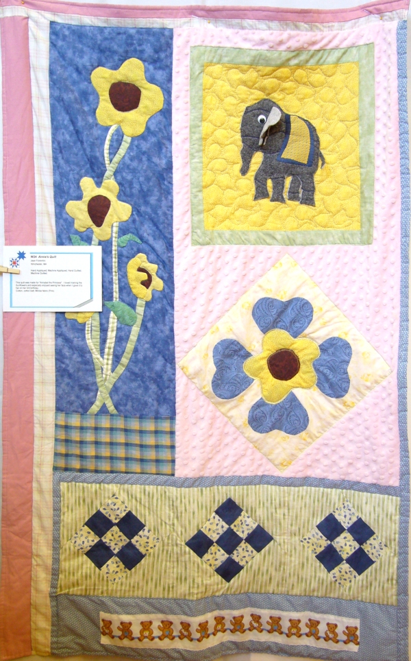 This quilt was made for "Annabel the Princess". I loved making the Sunflowers and especially enjoyed seeing her face when I gave it to her on her 3rd birthday. Cotton, cotton batt. Minkie fabric (Pink)