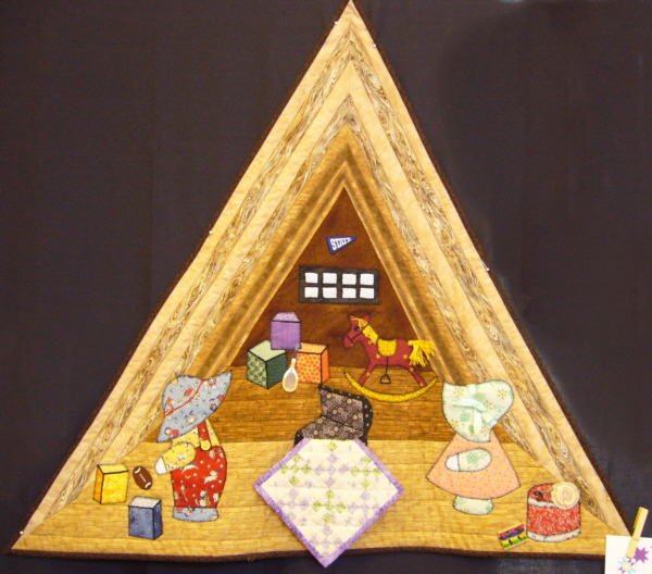The guild challenge in 2004 was 'Grandma's Attic.' I tried to use my own attic's triangular shape for the body of the quilt. This was my first try at drawing a quilt and then translating it into fabric. Most of the pieces were fused and then machine buttonhole stitched for a bit of an old-fashioned look. The little quilt is a separate piece. It won 3rd place that year and was juried into the 'Lowell Images' show.