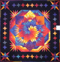 The pattern is from Jan Krentz's Lone Star Quilts and Beyond. Here was a quilt that made good use of my favorite bright colors. How could I resist' I decided it needed to be bigger and designed a border to go with it. The radiant stars were paper pieced, while the rest was machine pieced and quilted. It won 1st place for large quilts that year and was later juried into the 'Lowell Images' and 'The Gathering' shows.