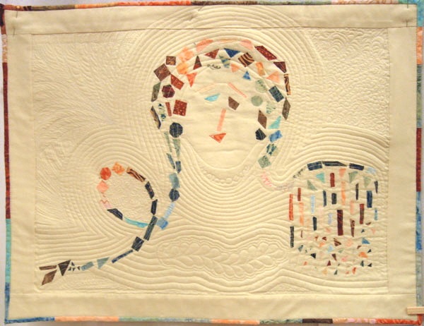 This wall hanging began as an experiment in abstract design. Not surprisingly, a woman began to emerge. For me, it expresses the compelling nature of fabric and the project ideas that float through my awareness. I also wanted to experiment with free motion fills. She makes me smile!