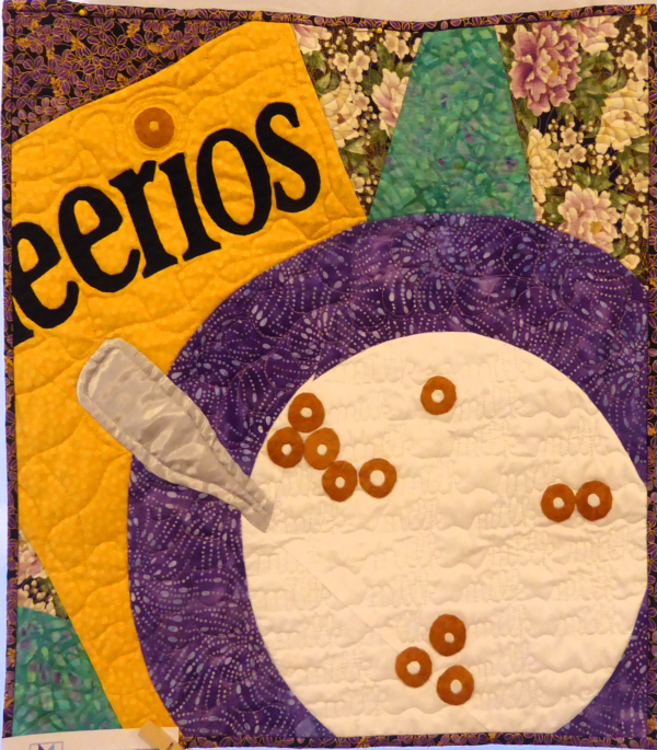 Hmm, what kind of box? Cheerios, the classic infant finger-food! Pieced from a drawing on freezer paper, with appliquéd letters on the box.