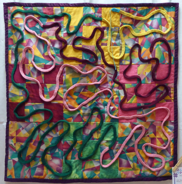About 60 years ago as a little girl I made the long knitted braid using a wooden spool with nails & a crochet hook. (Called Knitting Nancy or Horse Rein). This year I finally decided to make a quilt to put it on. Thanks to Marcel Proust for the title "In Search of Lost Time."