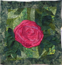 The rose was machine appliquéd and then I used the trapunto technique to enhance it. The background is free cut pieces that are topstitched in place. The 3D leaves are double sided and the viens are free motioned stitched with 12 wt. thread.