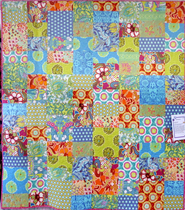 Fabric designer and artist, Amy Butler, retired in 2018. I thought it would be fun to put a quilt made with one of her fabric collections in the show to honor her career. Amy is renowned for her bold saturated prints. This line is Soul Blossoms and the back is made with flannel from her Love collection.